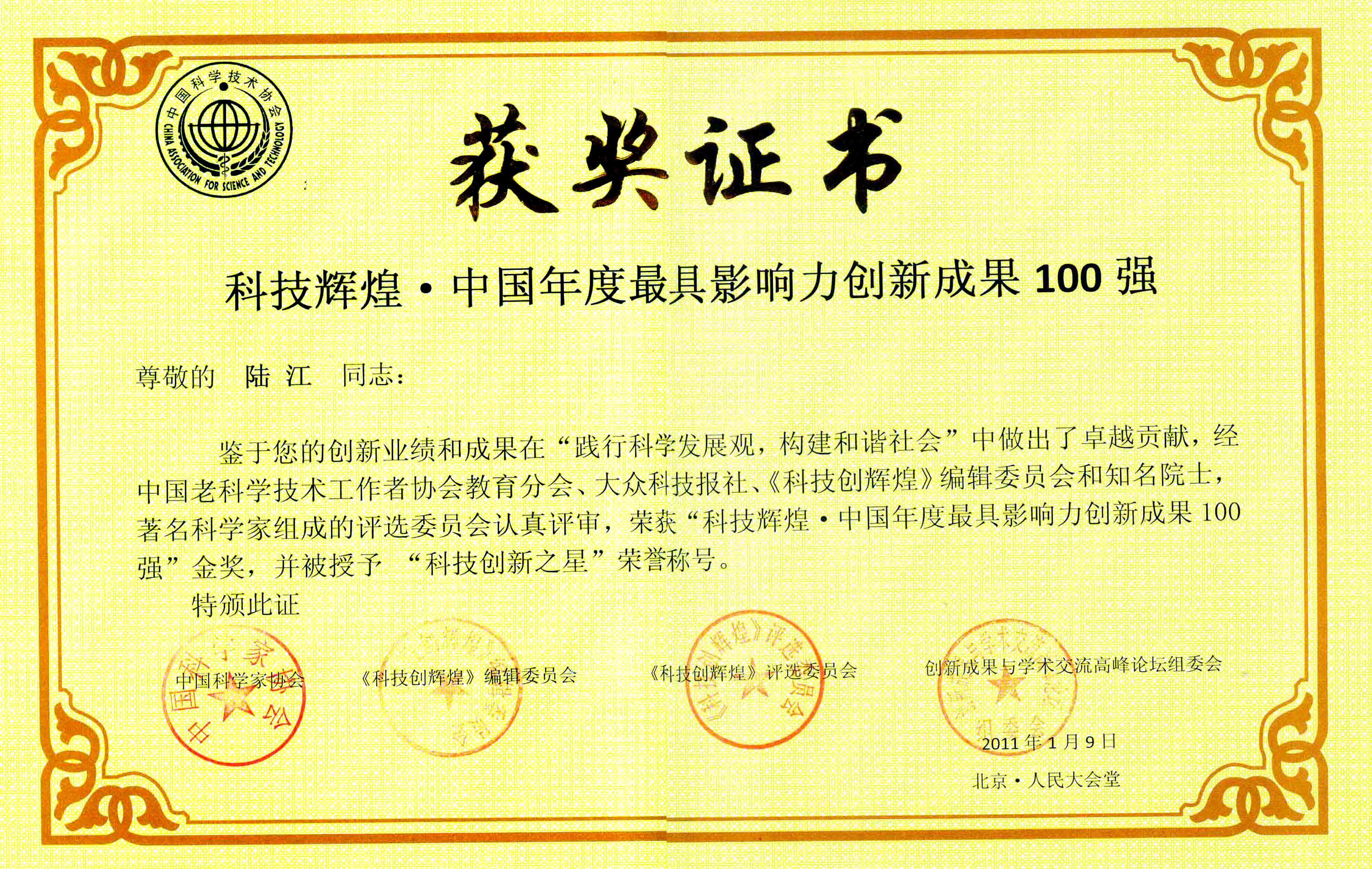 陸江的論文獲一等獎榮譽證書-- 陸江論文獲創(chuàng)新論文獎牌
