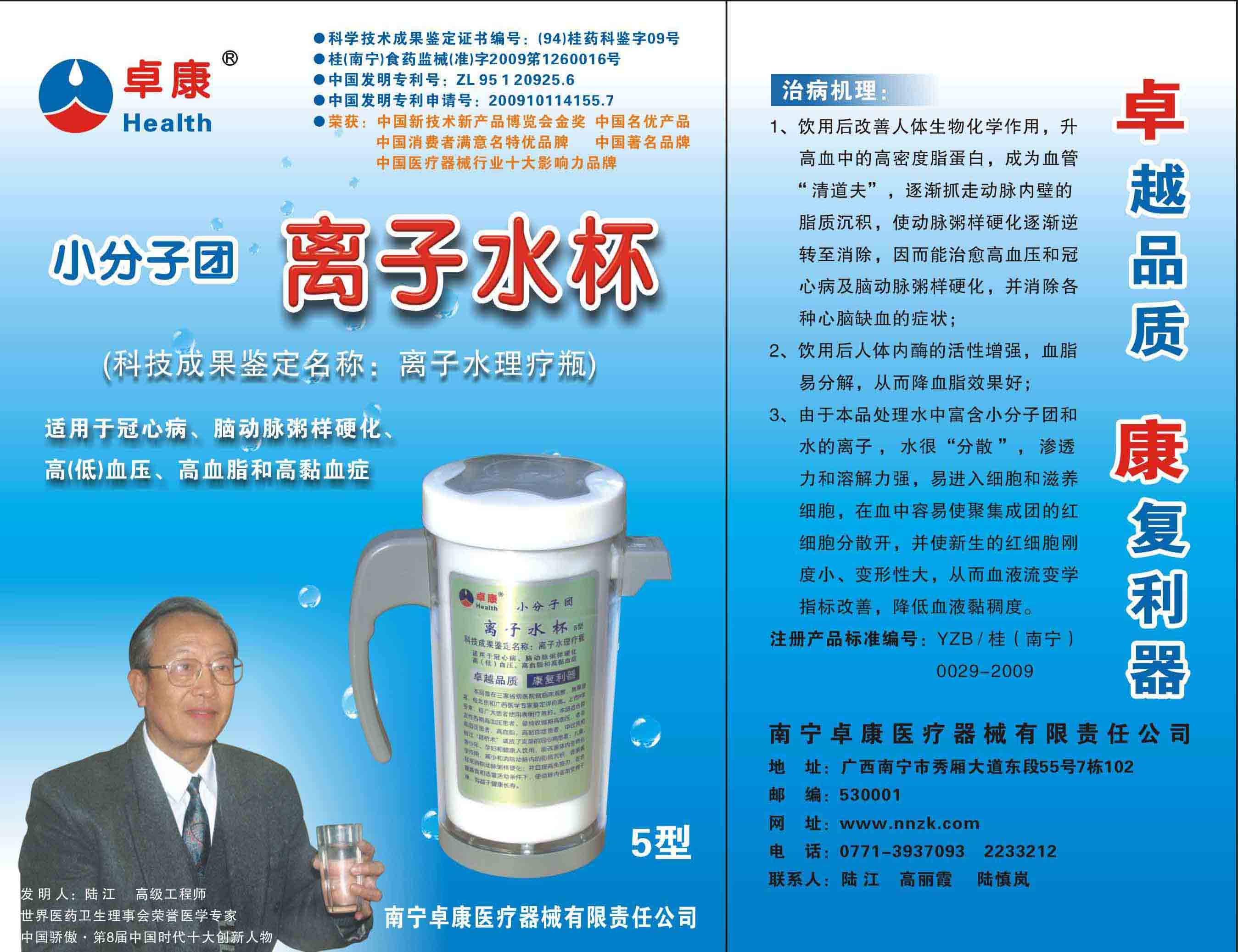 -----我是從事建筑的高工,本來沒有資格去攻克醫(yī)學難題,卻為了自身健康才扣響醫(yī)學的大門。由于我1990年患高血壓,因怕中風才研究發(fā)明了離子水瓶,我把水處理成微小分子團水,飲用后治愈了高血壓。便于1993年底送到三家省級醫(yī)院做臨床試用4個月。經(jīng)北京和廣西醫(yī)學專家鑒定:"降脂降壓效果好"," 能擴大心腦動脈流量,改善心腦電圖以及微循環(huán)","對治療心腦動脈粥樣硬化、高血壓、高血脂有良好的醫(yī)療保健作用。""產(chǎn)品的技術性能和療效達到了同類產(chǎn)品的國內領先水平,經(jīng)廣西醫(yī)學科學情報研究所檢索,未見國外有類似報道。"中國醫(yī)學科學院張正國教授從美國國立醫(yī)學圖書館數(shù)據(jù)庫存Medline檢索英俄文資料,均未見類似報告。2000年上市后,我為了對消費者負責而繼續(xù)觀察研究,一直通過《信譽卡》和《質量跟蹤調查書》向患者承諾療效,請用戶使用6個月后反饋效果。和脂壓患者飲用2至5個月內,消除癥狀,停服藥物,血壓正常;冠心病患者飲用3~5個月逐漸減輕至消除心絞痛、房顫等癥狀,不再服藥,飲用1年左右心電圖正常,經(jīng)冠脈造影掃描無明顯狹窄,表明冠心病痊愈。大量患者還反映許多衰弱器官被修復,讓前列腺增生、慢性咽喉炎、慢性氣管炎、支氣管炎、慢性胃炎、腸炎和膽囊炎等不藥而愈;2型糖尿病患者是因為胰島衰弱致病,飲用該水半年至一年,逐漸減藥至停藥,血糖尿糖正常,真正治愈2型糖尿病。中風后遺癥患者飲用六七個月,可逐漸減輕至消除肢體和語言障礙,表明飲用該水能讓壽命很長的神經(jīng)元細胞逐漸修復,奇跡般地恢復肢體和語言功能。飲用后還使胸腺和脾臟兩個重要的免疫器官被修復和增強,產(chǎn)生免疫細胞多,提高了免疫力,使人不生病或少生病。自此, 飲用微小分子團水創(chuàng)造了攻克冠心病、高(低)血壓和糖尿病三大醫(yī)學難題的奇跡。人們對此感到不可思議,但實踐是檢驗真理的唯一標準。